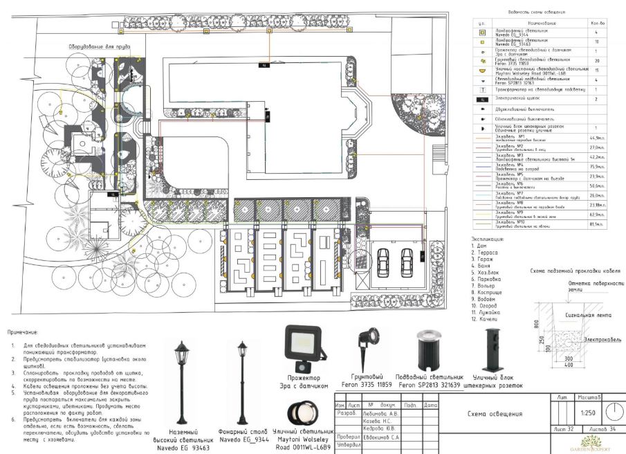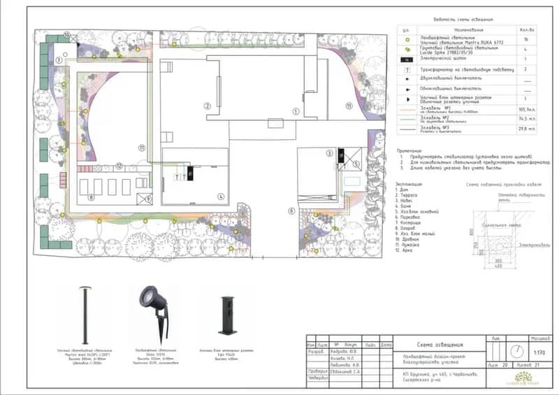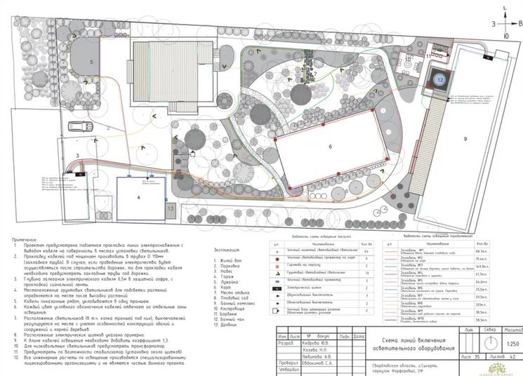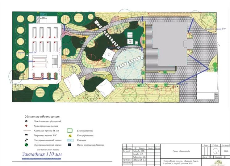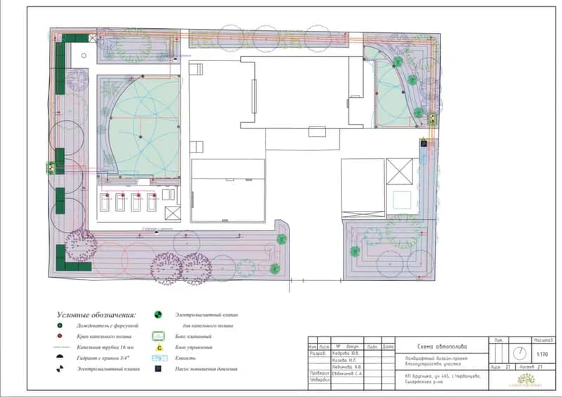Перед проектированием анализируем все действующие и будущие сети: электричество, водопровод, канализацию, дренаж, автополив. Это помогает избежать повреждения коммуникаций при работах, штрафов за нарушения и дорогостоящих переделок