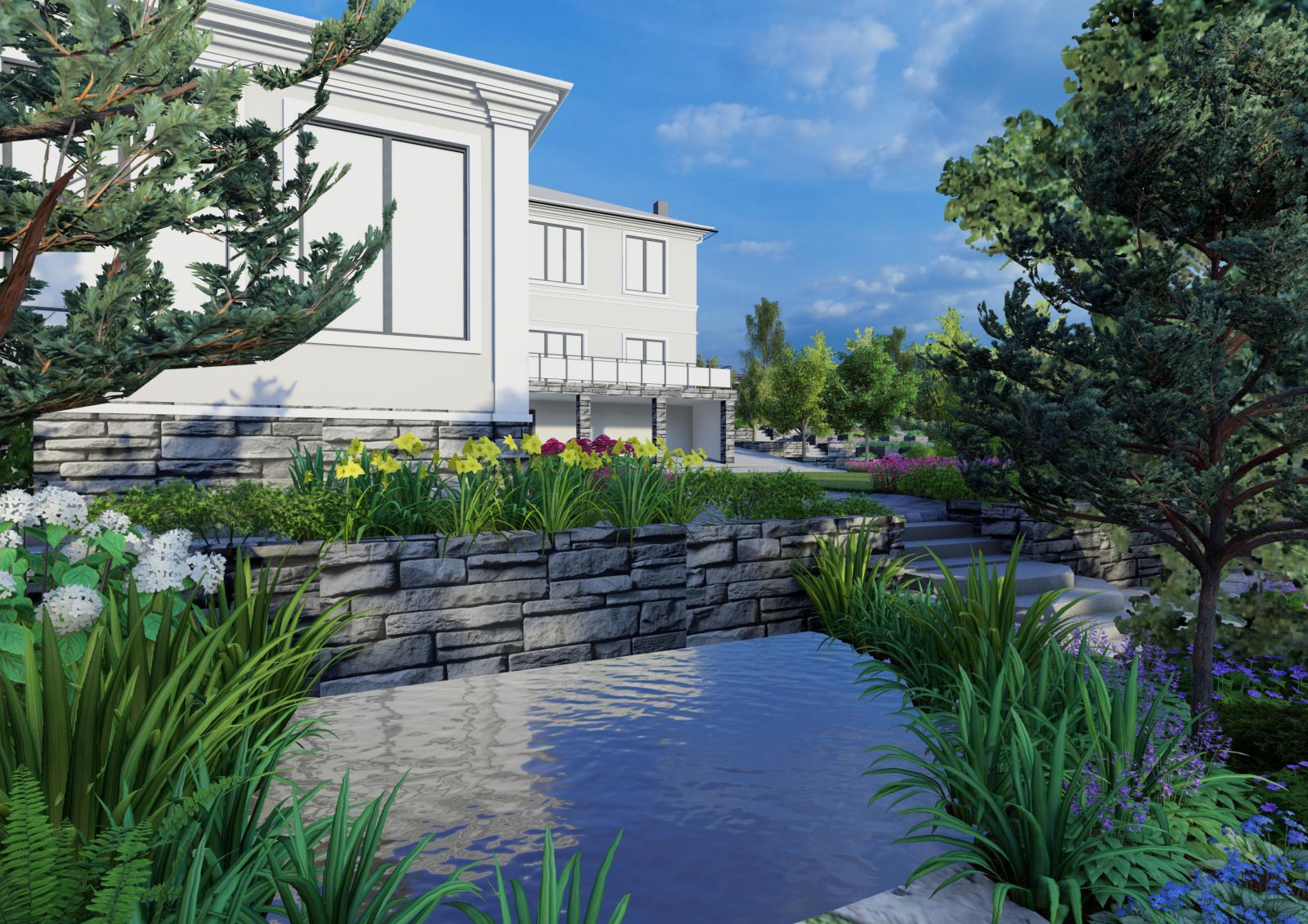 Проектируем дренаж, ливневку, дорожки, автополив и освещение как единую систему.